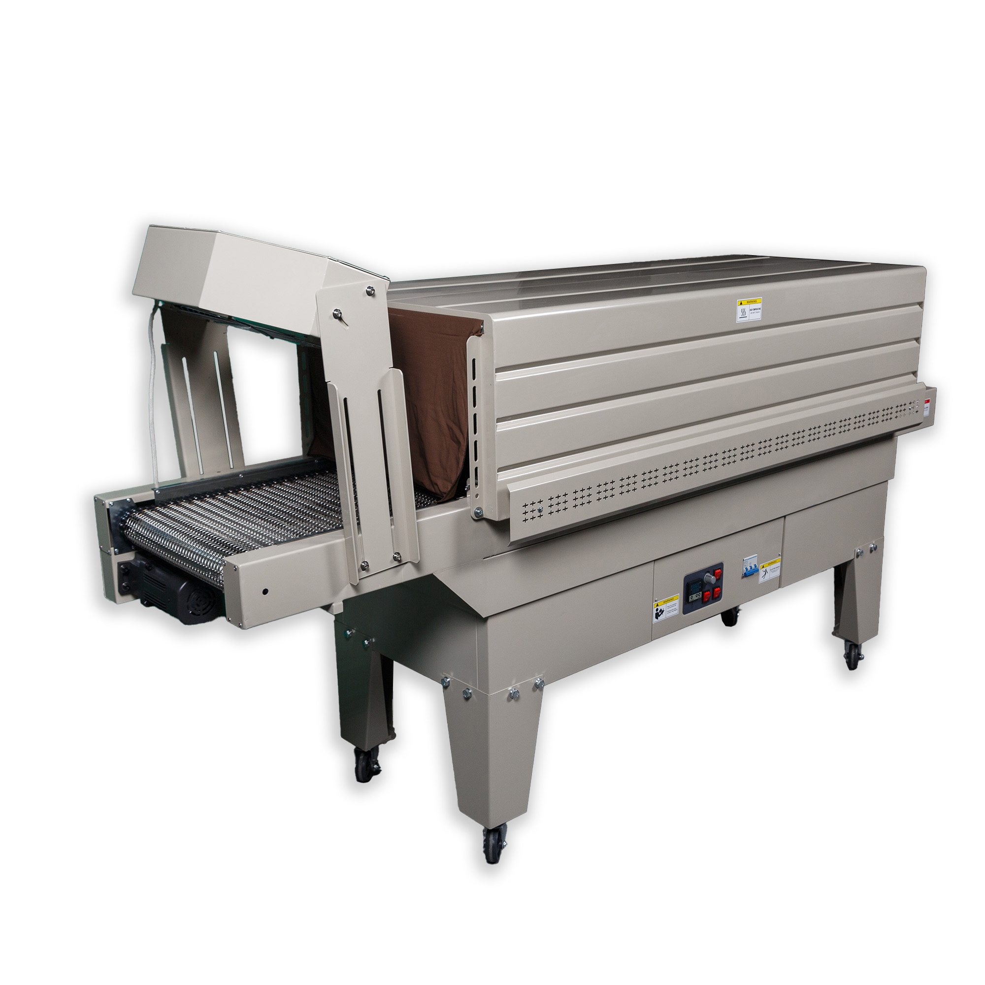 Термоусадочный тоннель BS-6535LA для PE пленки – кастомизированная обновленная версия предыдущей модели, поставляемая в комплекте с сетчатым конвейером.